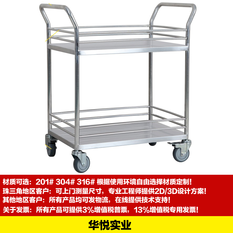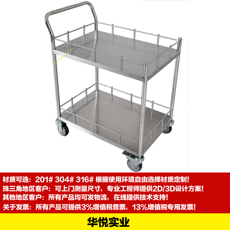 不鏽鋼手推車特點外觀精美、是一種平麵運輸設備,它在大小範圍內作業的方(fāng)便(biàn)性、實用性能適合大多數條件下少量、小範圍的臨時短途運輸,無聲靜音,手感超好、結實耐用、承載力好、自由移動 、走行輕快:由於腳輪采用(yòng)了特殊的設(shè)計,減輕了始動(dòng)抵抗和走行抵抗。使本產品達到了走行輕快化、平整、安全,強(qiáng)度(dù)好、美觀、耐用,耐酸、耐堿、防鏽、輪子可采用防靜(jìng)電靜音輪、普通輪。歡迎新老客戶來(lái)電洽談!
